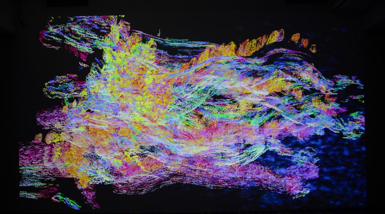 Where boundaries between ideologies and identities are rigidly drawn, K-COSMOSIS subverts these divides, highlighting the inherent relationality and inter-subjective nature of reality. Viewers experience thought and matter as non-linear and inter-constitutive, where multiple dimensions of meaning haunt one another to construct the narratives and fictions that dictate our experience of reality. Deeply rooted in an experimental, interdisciplinary, and process-based approach, the piece uses digital particles to embody a philosophical narrative of connectedness and continuous flux.